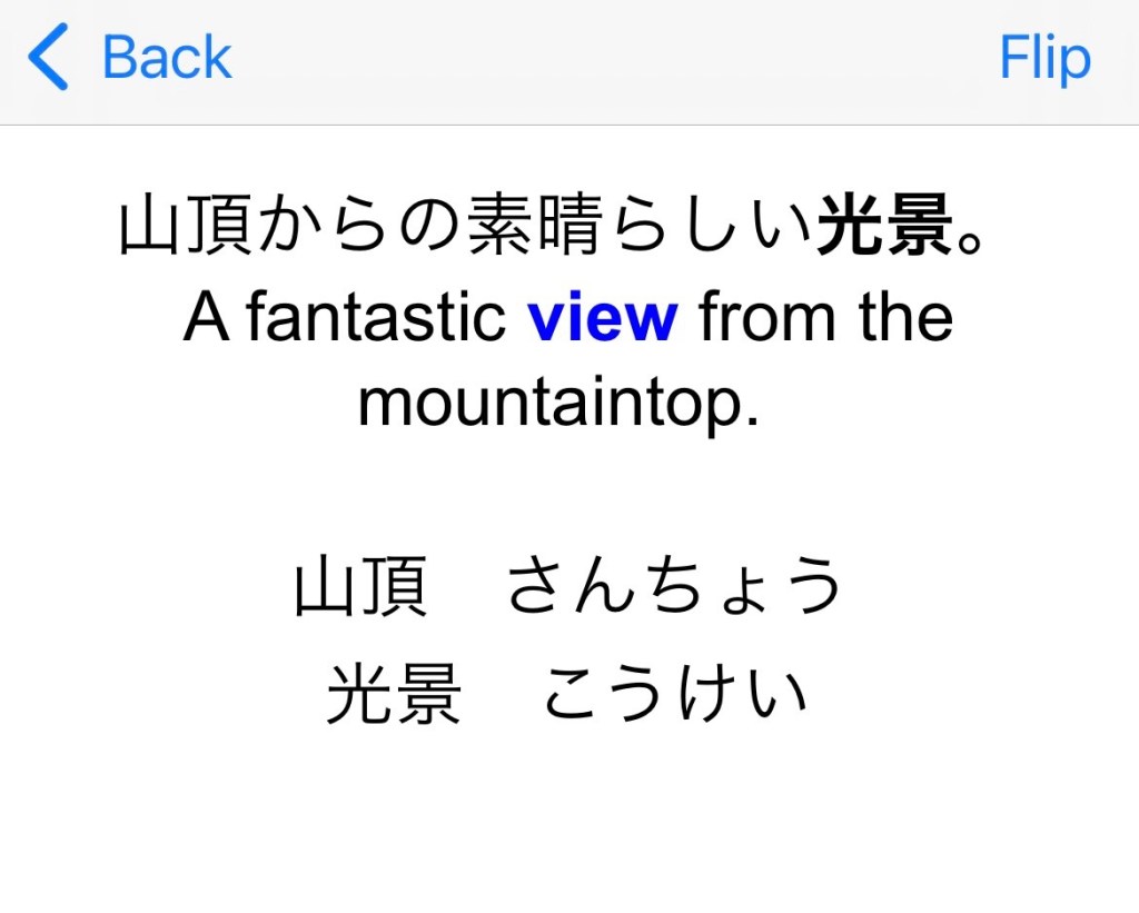 Previously, I made my flash cards too long, too complicated. I had both “recall” (English to Japanese) and “recognition” (Japanese to English) fields in the same cards, and the sentences were long and took time to read.