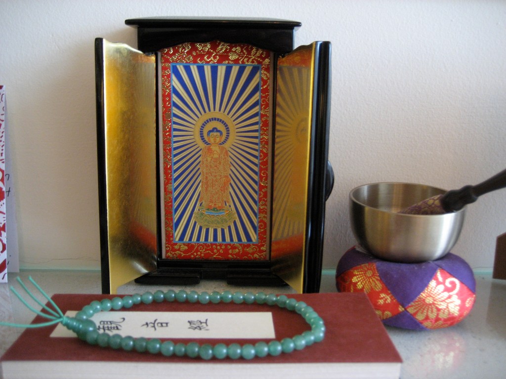 У багатьох буддистів вдома є невеликий вівтар для Будди або іншого буддійського божества. Ви можете вибрати будь-яке божество. Ви можете використовувати статую, сувій або навіть картинку з Інтернету. Перед вівтарем люди зазвичай кладуть квіти, ладан і рис (або хліб, пластівці тощо). Будь ласка, не пропонуйте м’ясо чи алкоголь.