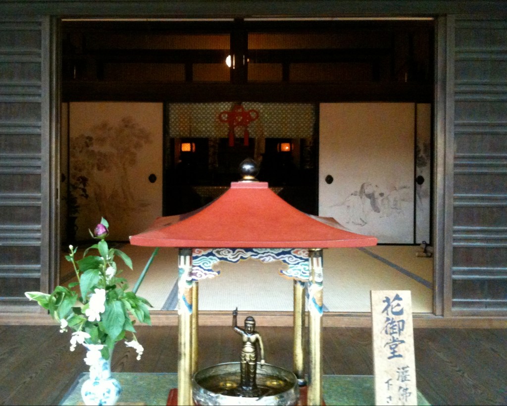 In Japan, flower displays like the one shown above are frequently used in Buddhist temples, and people are welcome to pour a ladle of sweet tea over the statue, in commemoration of the heavenly divinities that poured blossoms and perfume over the baby Buddha. Thus, the Buddha’s Birthday is colloquially known as Hanamatsuri (花まつり, “the Flower Festival”) in Japan, rather than its more stodgy name Gōtan-é (降誕会, “Nativity Day”).