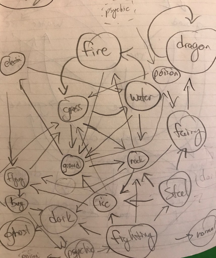 My son would frequently ask me what such-and-such type is weak too, especially under lockdown as he has more time to play Pokemon games, and I would have to look at various online charts to remember which types do more damage to which types, etc. This got tedious, and the existing online charts were too hard to memorize, so I started mapping my own chart.