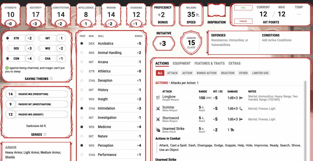 Update: I have been having fun with this character quite a bit, especially after I got a hold of some Gauntlets of Ogre Strength, which frees up my build resources to focus on other things than Strength. Further, I took the feat Elven Accuracy at fourth level. Elven Accuracy pairs very nicely with the samurai’s Fighting Spirit feature, and lets Heian Amakiiro shoot his longbow very accurately. Thus, so far Heian has been capable of handling melee combat effectively, but also as an archer. At sixth level I took Sharpshooter as a feat as an extra boost to his archery skills. From here, I can