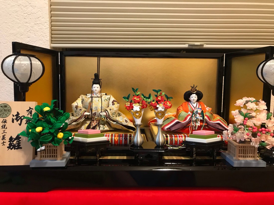 Around the dolls are various auspicious symbols: orange tree for long life, stacked mochi rice cakes for wealth, etc.