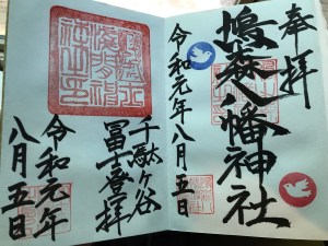 My last stamps are from 2019, my last trip to Japan before the pandemic, which also happens to be the first year of the reign of the Reiwa Emperor, so the stamps show 令和元年 (reiwa gannen, “inaugural year of Reiwa”). These stamps were both from Hatonomori Hachimangū Shrine (a very cool and underrated shrine) and probably a fun subject for another post. The “dove” stamps are because the “Hato” in the shrine name also means “dove”.