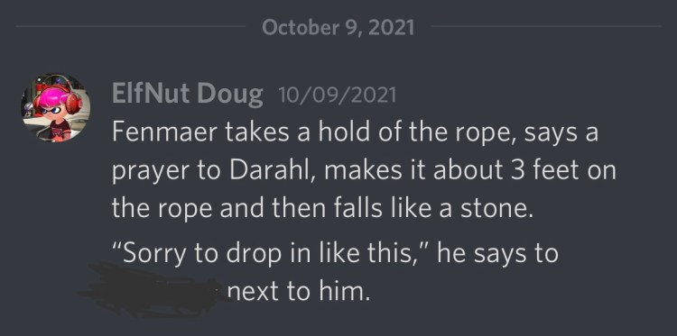 The other issue is delays. PBP naturally has a slower place than a sit-down game, but sometimes life happens and players may not respond for a while. In some rare cases, they may not be able to respond for weeks. We had some incidents in the past months where a player had a genuine commitment or family issue that arose, and the adventure simply can’t continue without that player. For shorter delays, a little extra role-playing can tide you over, but this will eventually run out.