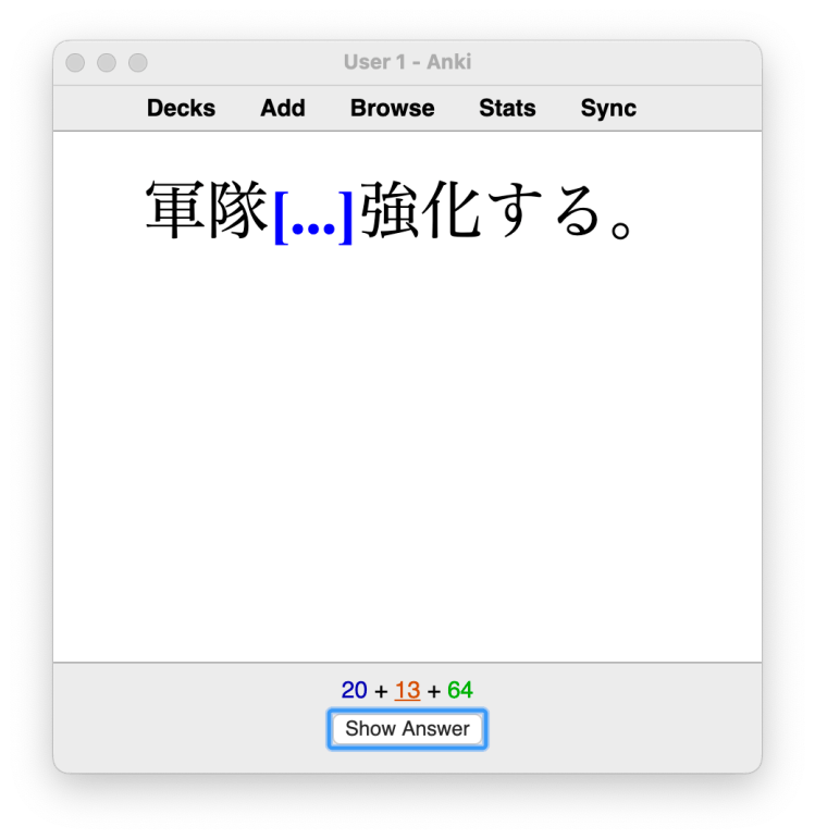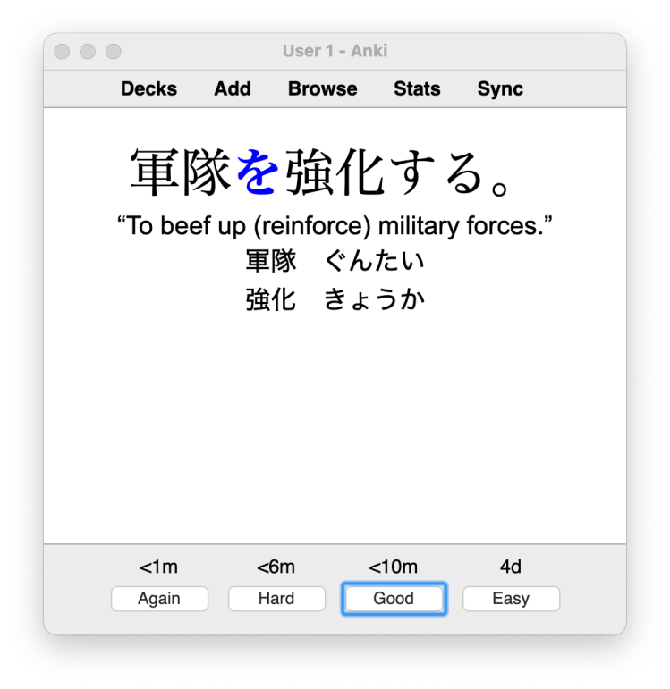 The word I wanted to focus on learning was the verb 強化する (kyōka suru) meaning to intensify or strengthen. So, rather than just throwing it in my flashcard deck, I looked it up on my favorite Japanese online dictionary and found an example sentence I liked. From there, I found an example sentenced I liked and put that in. Notice that I did not hide the word 強化する. I wanted to be able to read the word, not necessarily recall it, but I do need to be able to recall what particle it uses. In this case を, the direct-object marker. So, I hid that.