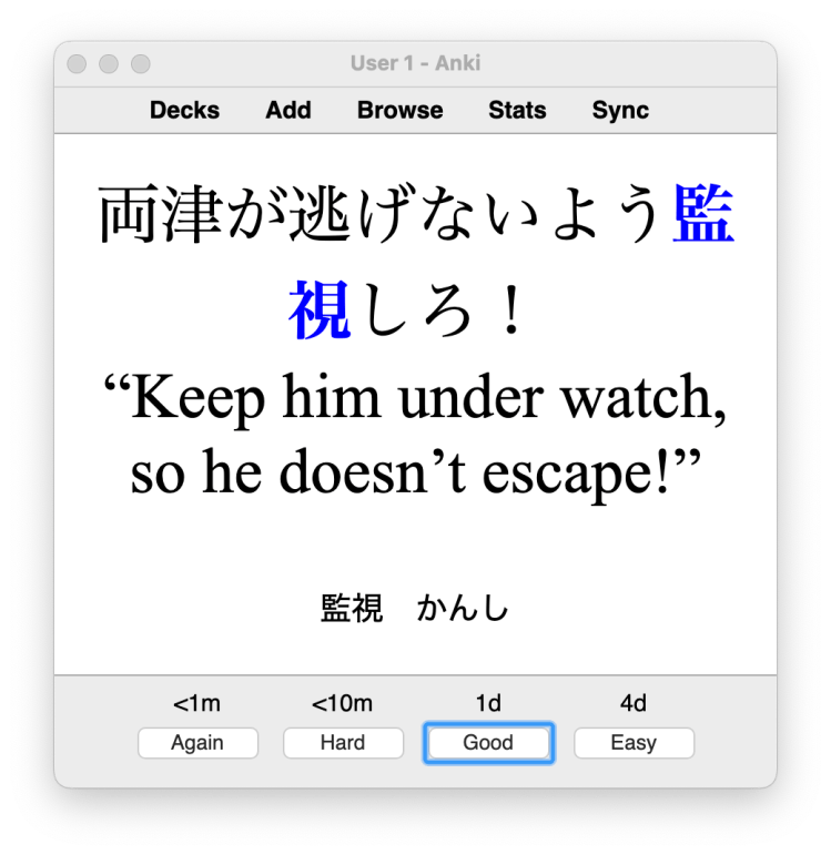 Here, I needed to learn the word 監視する (kanshi suru) meaning to observe or keep under watch. But the sentence I got from one of my manga was a bit awkward, yet useful in providing context. So I had to keep the English sentence in the flashcard.