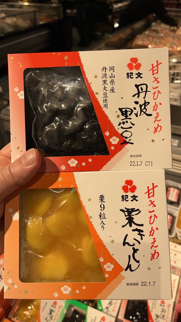 These are just sweetened black beans, and something I enjoy eating in particular. In the same picture, shown below are yellow kuri-kinton which is a kind of walnut paste.
