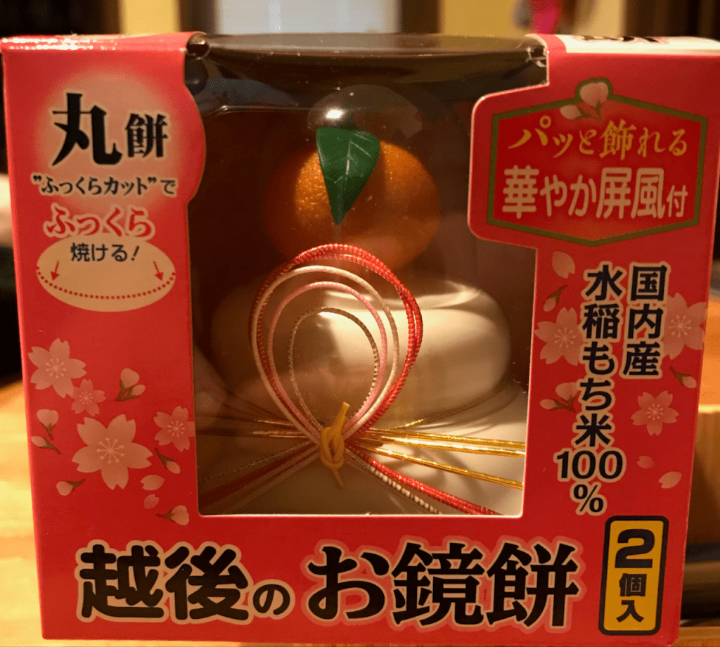 Kagami-mochi are a pair of mochi (rice cakes) stacked one on top of the other, usually with a ribbon around it, and a bitter orange or other decoration on top. I’ve talked more about it here. These are often available at any Japanese grocery store, and include instructions on how to set it up. Remember, on January 11th, there’s a separate ceremony to break open the mochi and cook it for good luck.