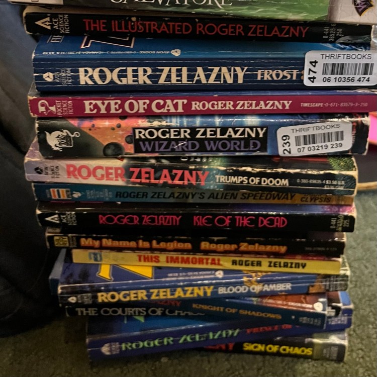 The den in our home has piled up a lot of things, and this weekend I finally looked around and found tons and tons of books I didn’t need, including some D&D books I just never used (and now don’t want), really old reference books that I might have used only once yet are taking up a lot of space, and a huge collection of old Roger Zelazny novels that I had been collecting:
