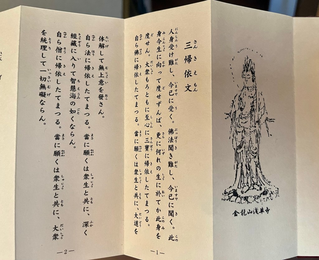 The liturgy to the left of the illustration is a form of Taking Refuge in the Three Treasures (san-ki-é-mon, 三帰依文) done in a more native-Japanese style, than the Sino-Japanese version I posted here. Both versions are perfectly valid and are chanted.