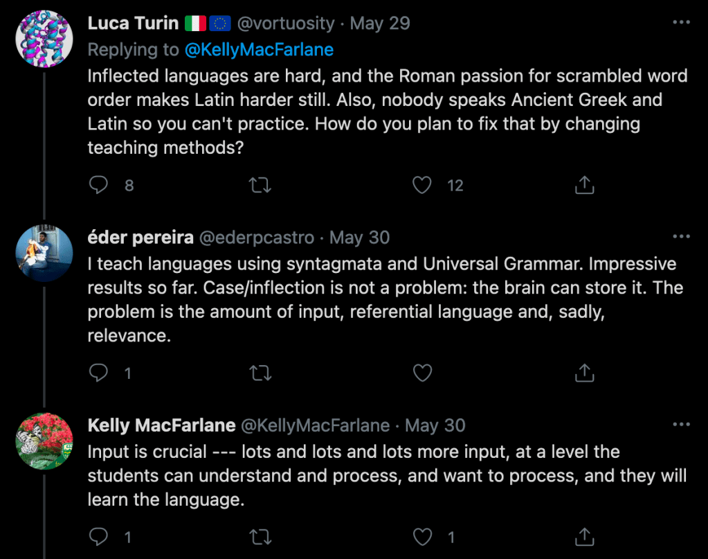 What does input mean here? Any kind of exposure you can find: movies, podcasts (my personal favorite), TV shows, just listening to other people speak in real life, etc. Soak it up like a sponge, and don’t get discouraged if none of it makes any sense even after 3 months, or 6 months. If you are learning classic languages like Latin and ancient Greek, just keep reading. Bit by bit, it’ll all become second nature.