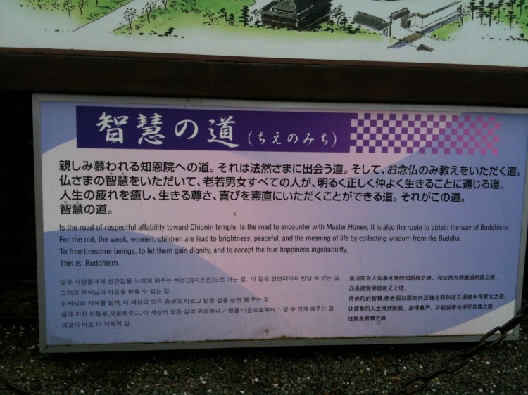 Taken in 2010 at Chion-in Temple in Kyoto, Japan, this is one of two head temples of Jodo Shu, and where Honen’s mausoleum is said to be. This was a sign posted near the main gate.