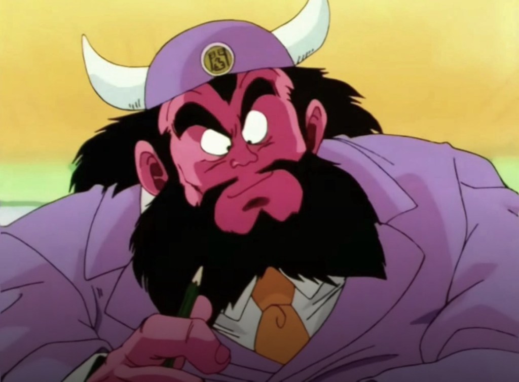 In Dragon Ball, Enma (sometimes spelled “Yemma” in English) presides the realm of spirits and behaves like a modern bureaucrat. In spite of the suit and tie, this Enma is definitely based on the original figure in Japanese mythology, named Enma Daiō (閻魔大王, “Great King Enma”).