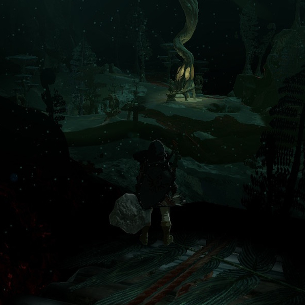 The world below is a world of darkness and misery. There is little life here, primarily predatory life, or creatures toiling away mining Zonaite minerals, and the air is stifling with spores (or ash?) in the air.