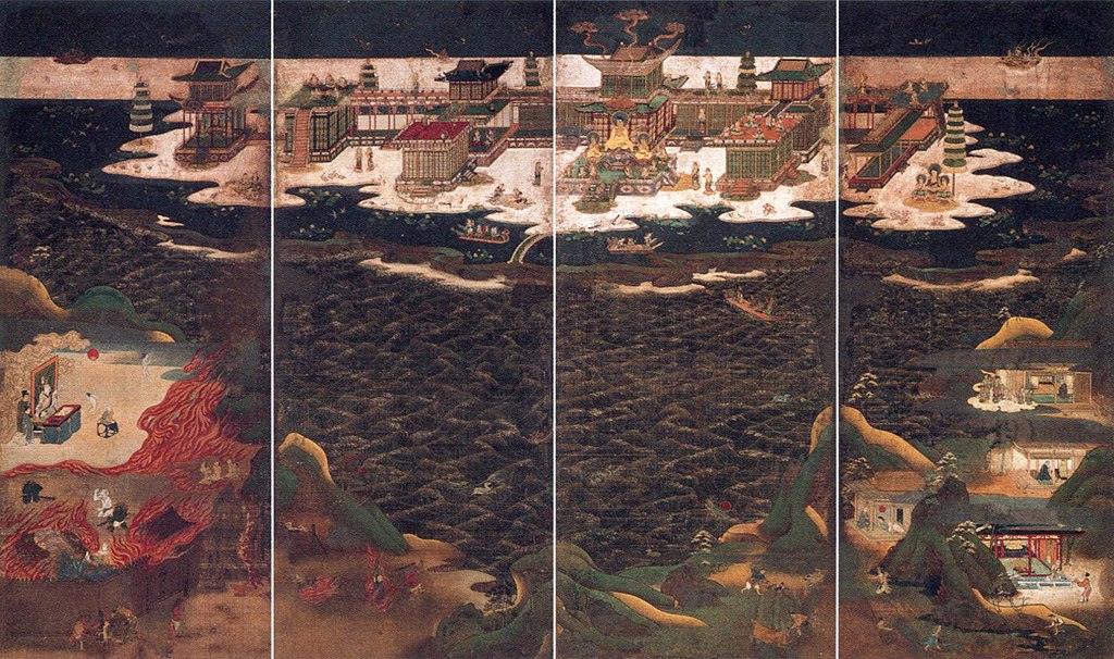 A 14th century painting depicting the Buddha’s Pure Land (top), Hell (bottom-left) and the mundane world (right). Painting courtesy of Konkaikōmyō-ji Temple, Public domain, via Wikimedia Commons
