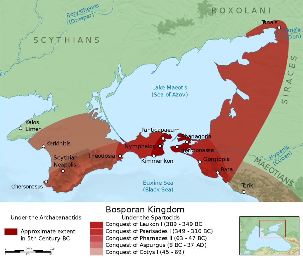 The humble beginnings of the Kingdom of the Bosporus began as a hodge-podge of Greek colonies in the Black Sea. The ancient Greeks were prolific colonizers in the Mediterranean because the lands of Greece have low agricultural output, and as populations grew, they needed places to grow and stretch. Famous colonies include Syracuse on the island of Sicily (home of Archimedes!), southern Italy a.k.a. Magna Graecia, Cyrene in modern-day Libya, as well as countless colonies in Spain, southern France, Asia Minor and so on.