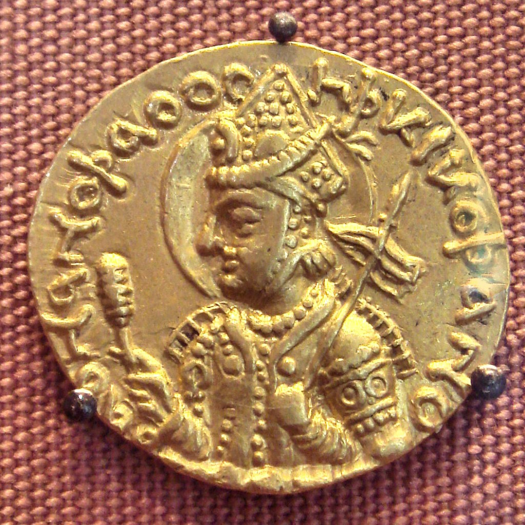 King Huvishka depicting in coinage from the era. Notice the halo behind his head. Public domain, via Wikimedia Commons