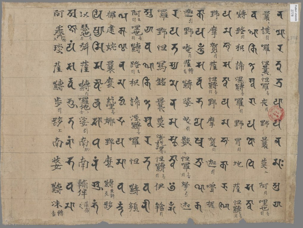 Fragment of the Nilaṇṭhanāmahṛdaya dhāraṇī both written in Siddhaṃ script and transliterated in Chinese characters. Bibliothèque nationale de France, Public domain, via Wikimedia Commons