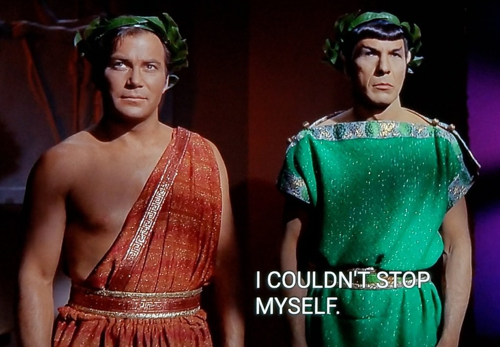 Captain Kirk and Spock wearing togas and laurels on their heads. From the episode “Plato’s Stepchildren”.